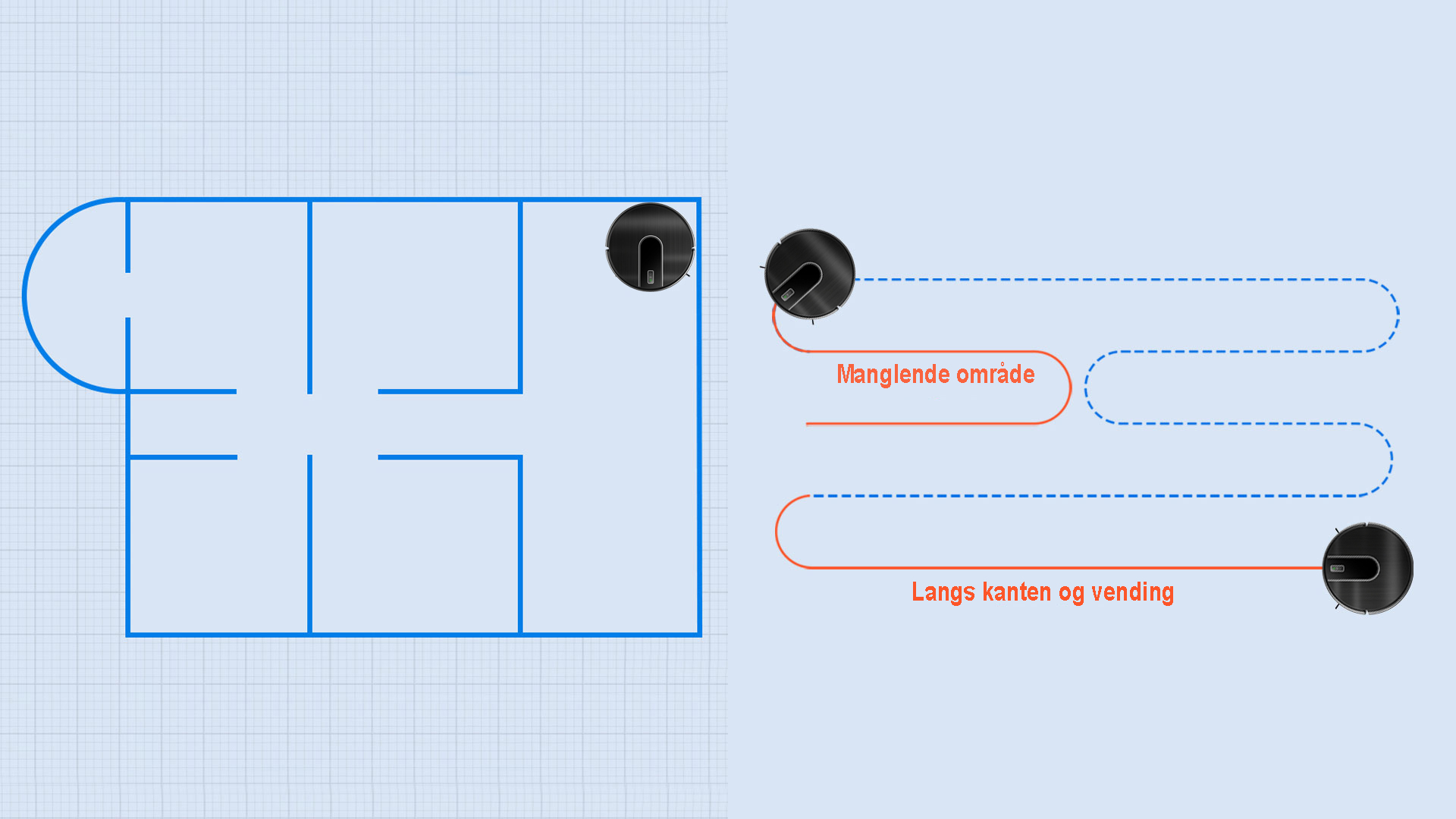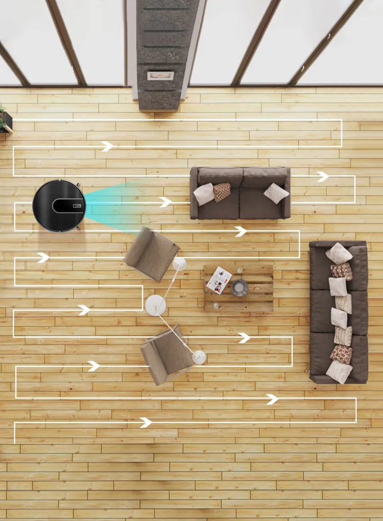 Koordinatlagringsalgoritmen gør det muligt for robotten at genkende omgivelserne og finde en genvej til opladning, når batteriet er lavt. Robotten beregner også, hvor meget strøm der er nødvendig til det resterende område, vender tilbage, oplader tilstrækkeligt og fortsætter derefter rengøringen.